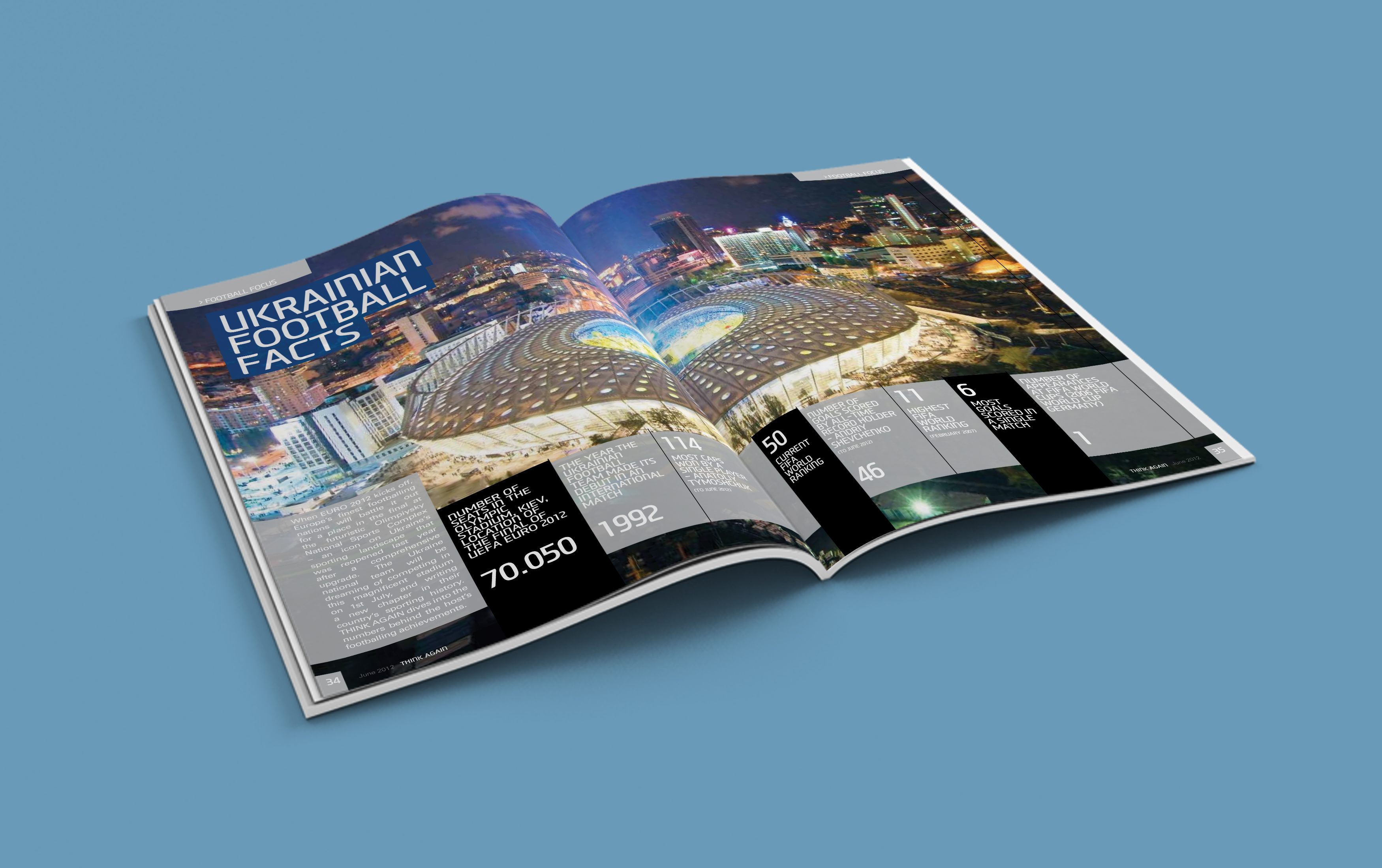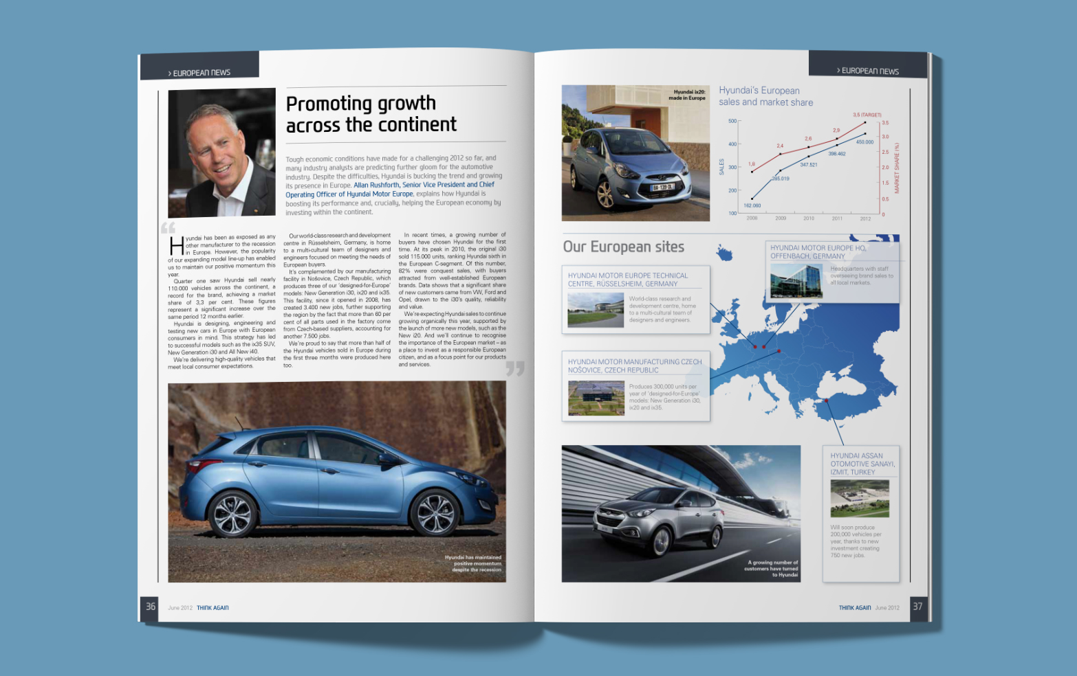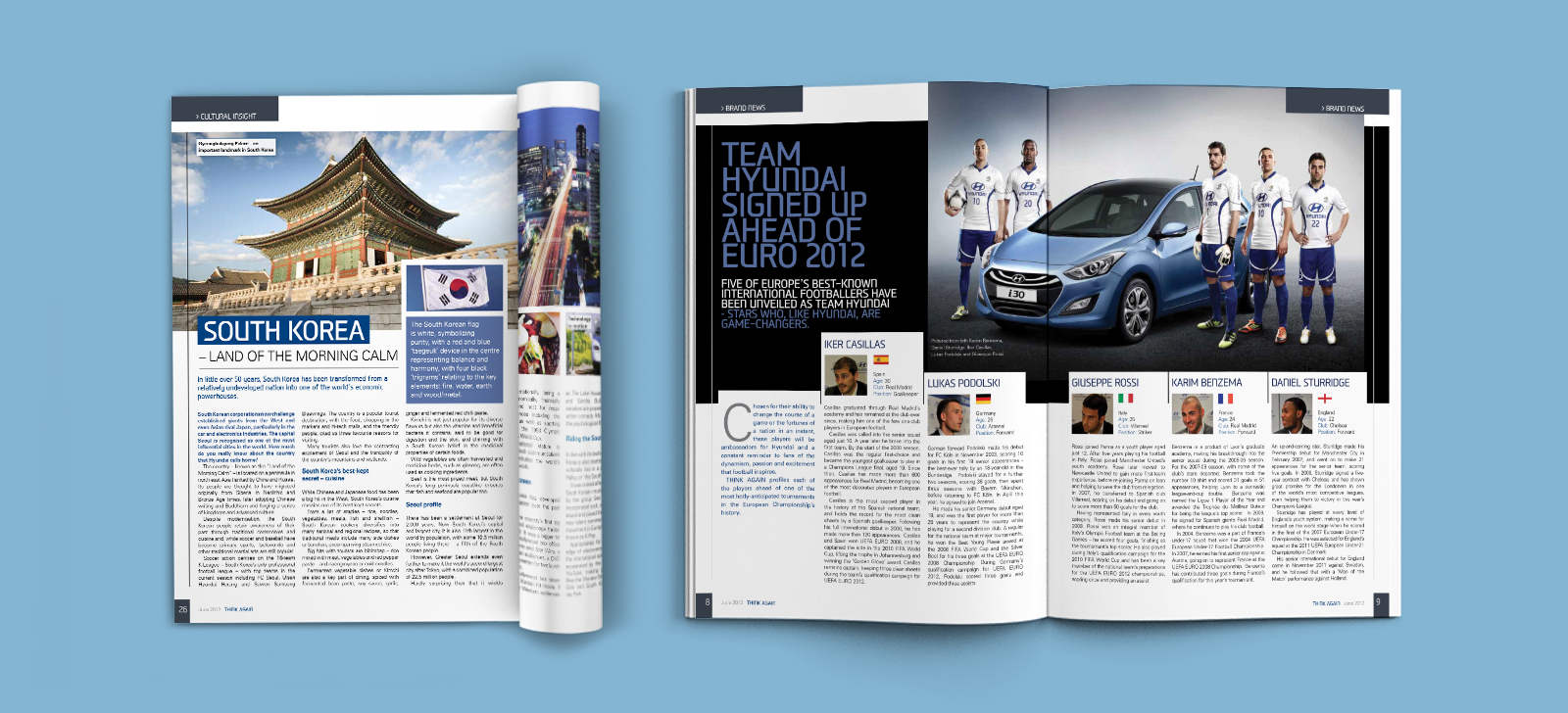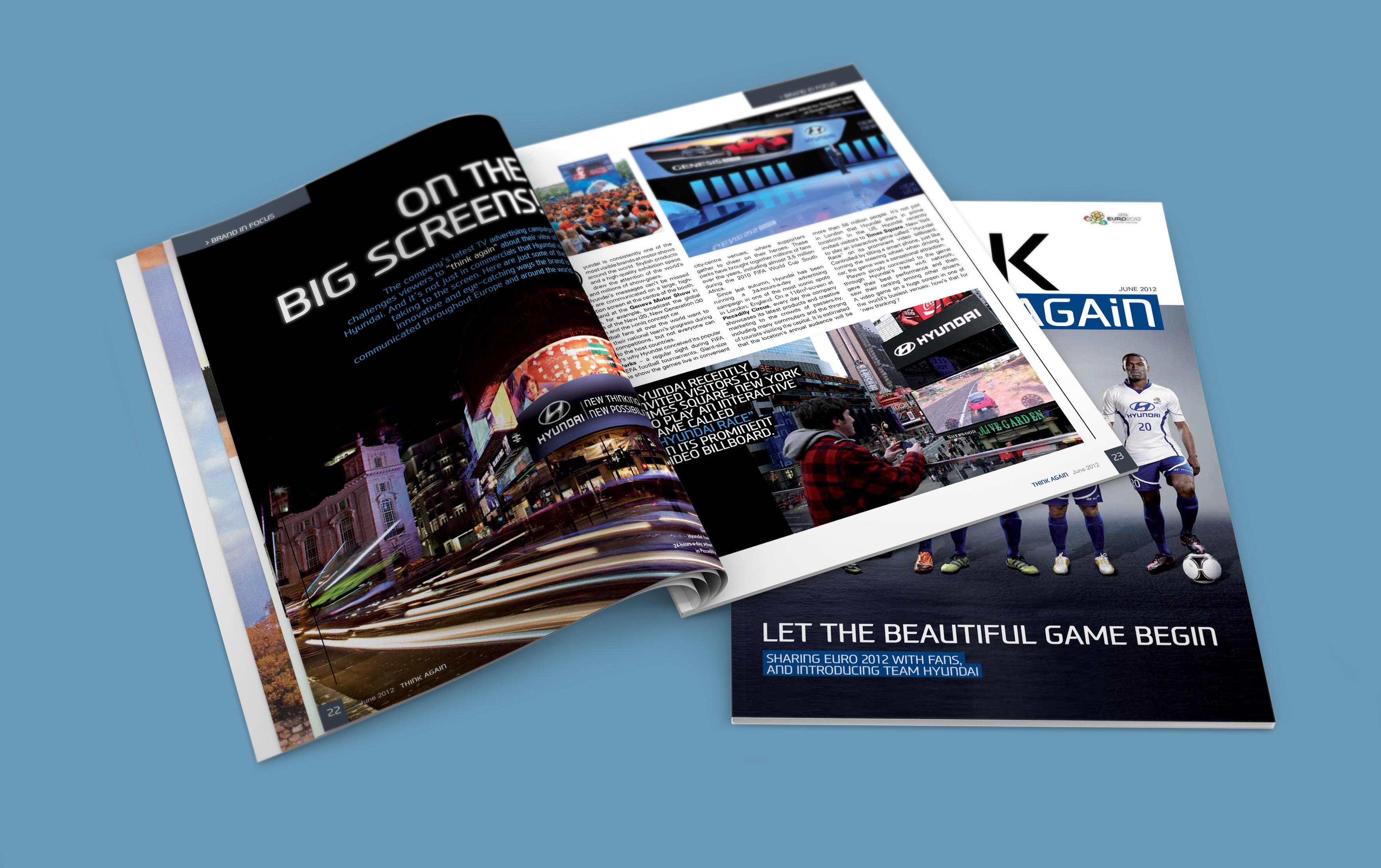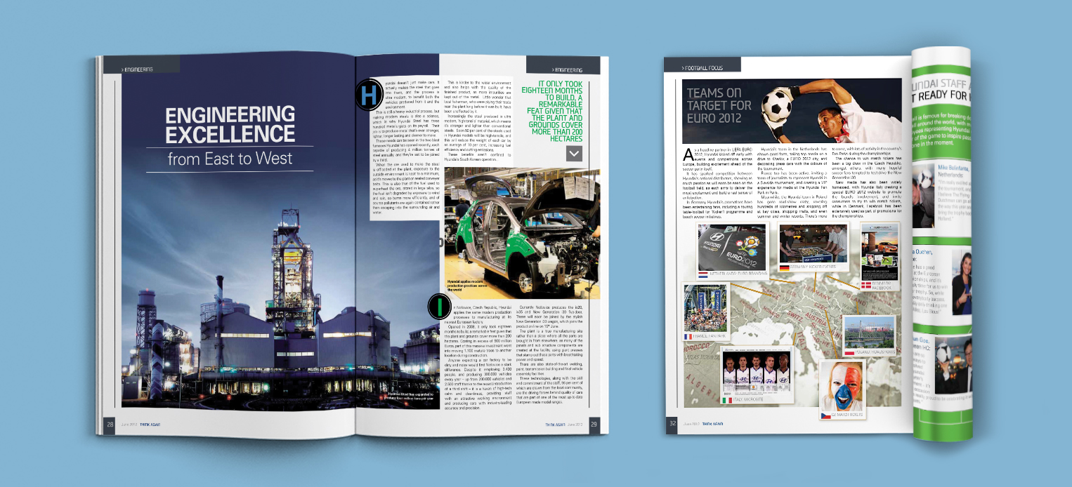 Published as part of its sponsorship of the European football tournament, Hyundai Europe required a one-off corporate magazine for distribution across Europe; as well as to Hyundai’s headquarters in Seoul, South Korea. I redesigned Think Again to reflect the company’s Eastern heritage as well as its international business.